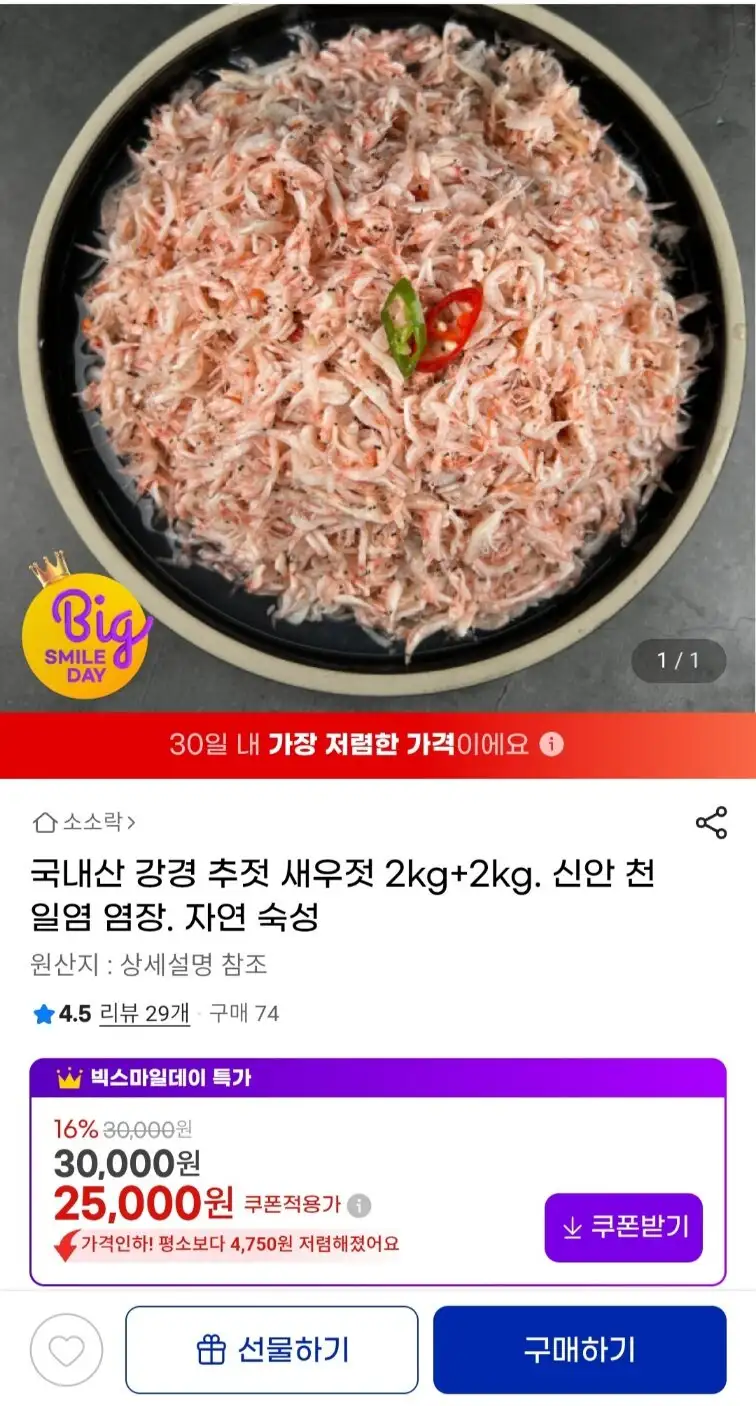 [지마켓] 국내산 강경 추젓 새우젓 2kg+2kg 신안 천일염 염장 25,000원 / 무배
