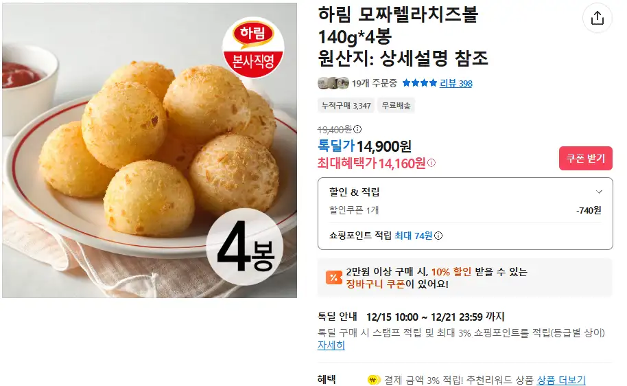 하림 모짜렐라치즈볼 140g*4봉