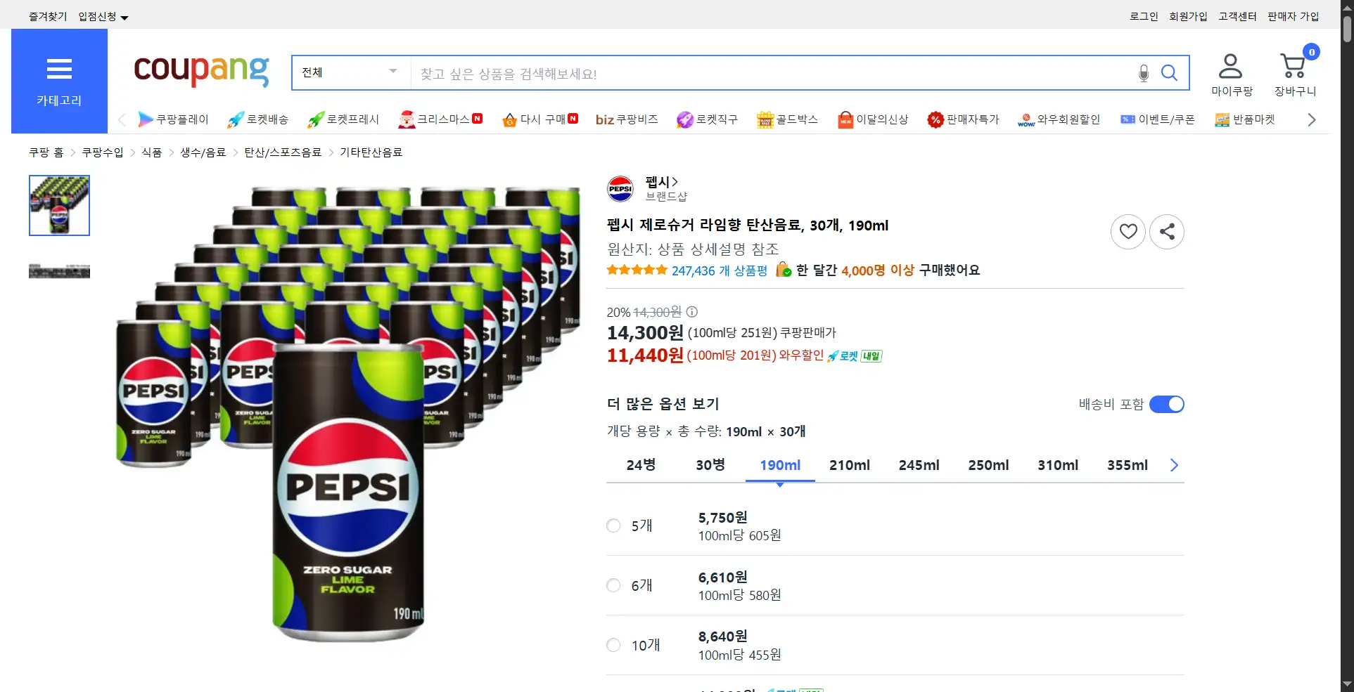 펩시 제로슈거 라임향 190ml 30개