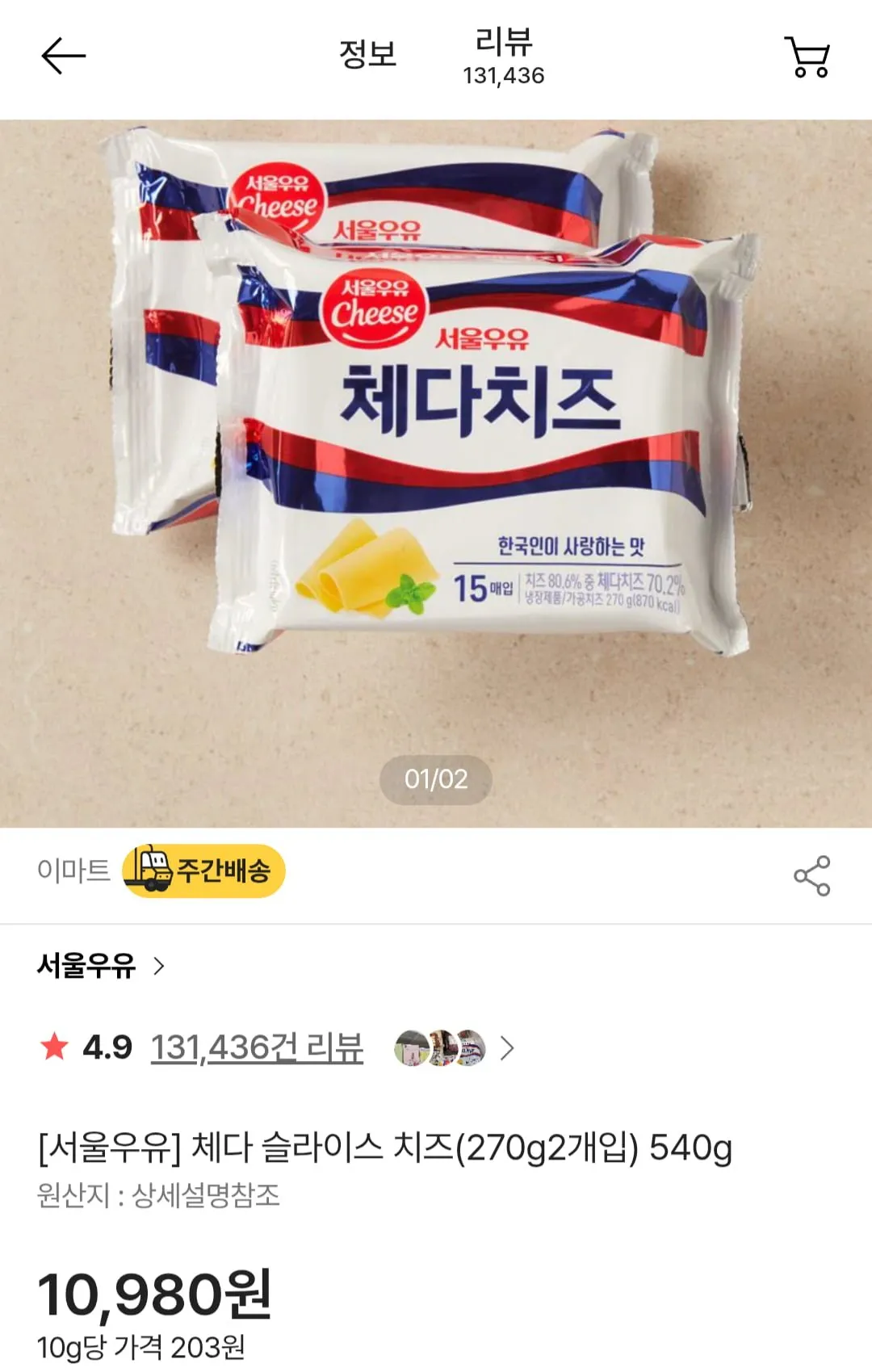 서울우유 체다 슬라이스 치즈(270g2개입)