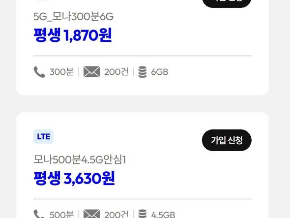 평생 4.5GB+1Mbps 500분 200건 3,630원