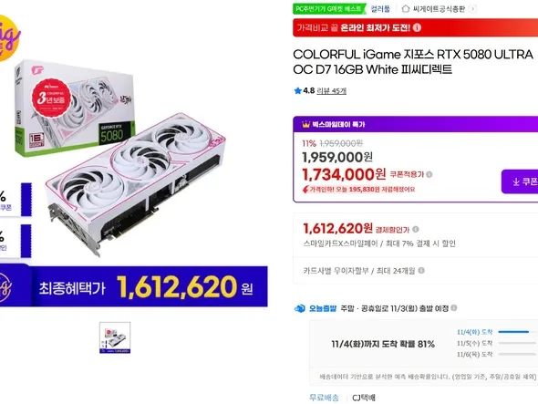 컬러풀iGAME지포스RTX5080울트라OC(161만원대/특정카드)