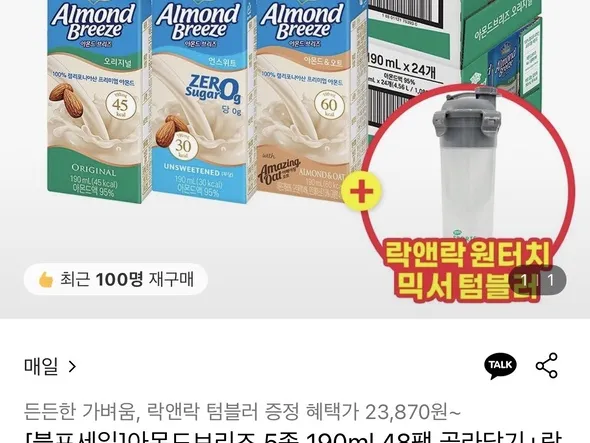 아몬드브리즈 5종 190ml 48팩+믹서텀블러 (23,870원...