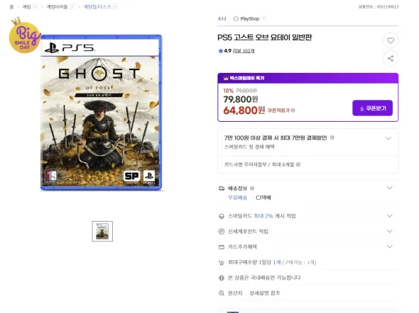 PS5 고스트오브요테이 / 빅스마일데이 64,800원