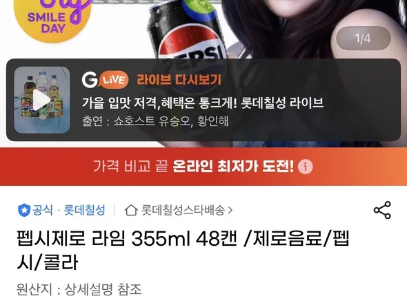 펩시 제로 라임 355ml 48캔 유클할인(27,300원)