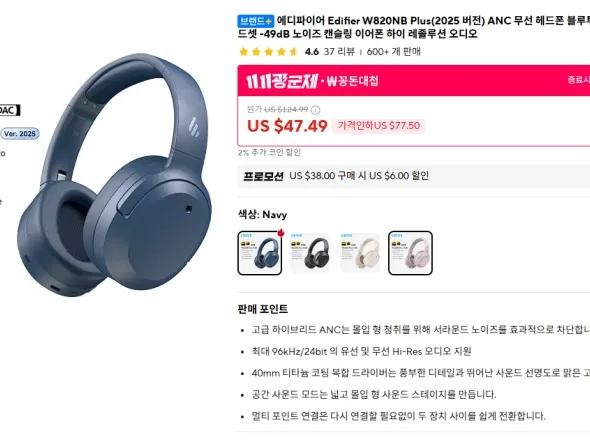 에디파이어 무선 헤드폰 W820nb plus (35.49달러)