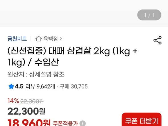 대패 삼겹살 2kg (1kg + 1kg) 수입산 /18960원