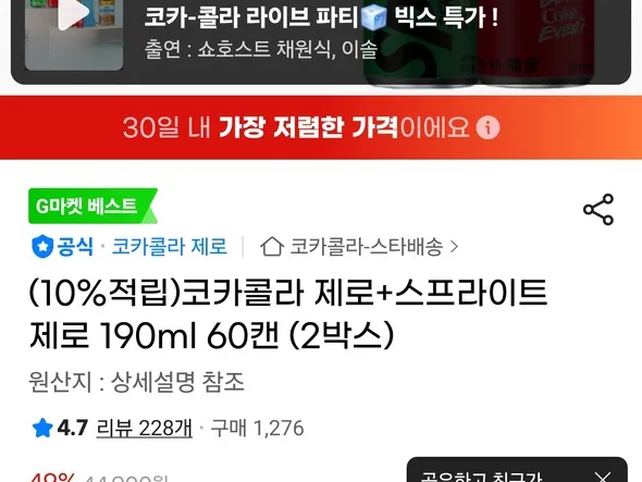 코카콜라 제로+스프라이트 제로 190ml 60캔 / 22460...