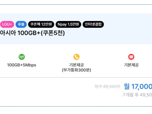 7GB+1Mbps 월 6,000원 (7개월) 요금제 외 다수