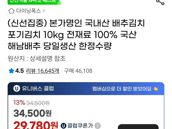 본가명인 국내산 배추김치 포기김치 10kg / 29780원