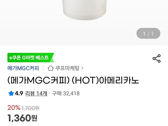 (메가MGC커피) (HOT)아메리카노 / 1360원