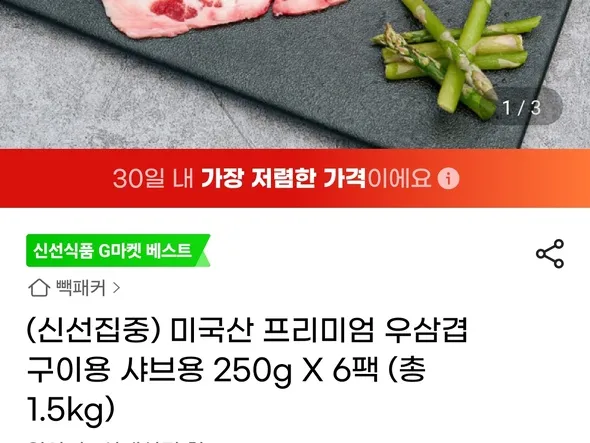 미국산 프리미엄 우삼겹 250g X 6팩 총1.5kg / 14...
