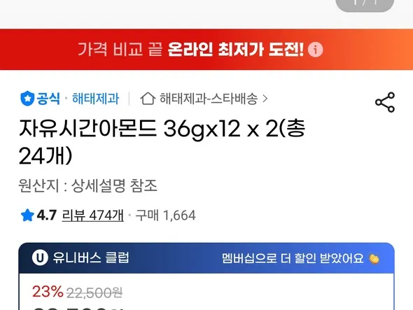 자유시간아몬드 36gx12 x 2(총 24개) / 17110원