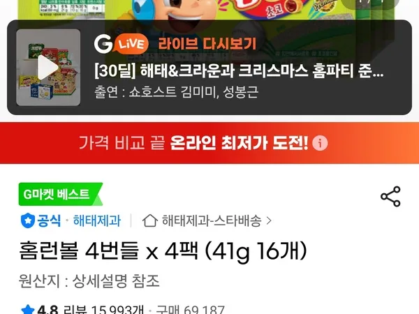 홈런볼 4번들 x 4팩 (41g 16개) / 13600원